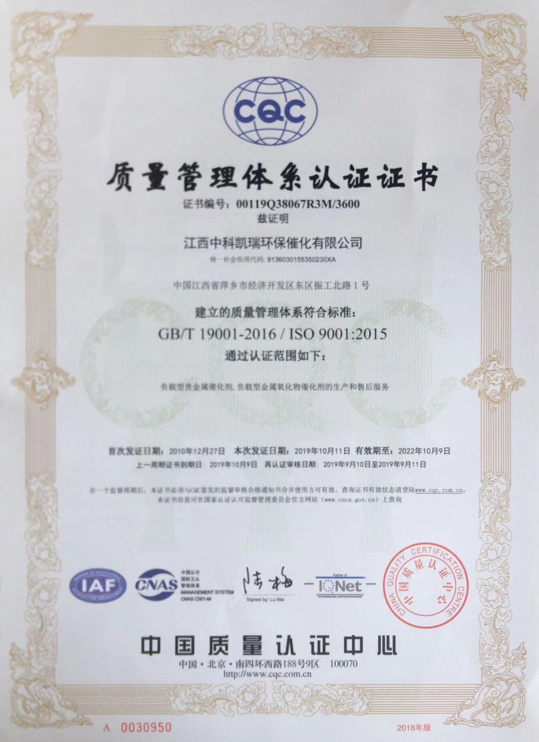 江西中科凱瑞環保催化有限公司建立的質量管理體系符合標準GB/T 19001-2016/ISO 9001:2015,通過認證范圍:負載型貴金屬催化劑、負載型金屬氧化物催化劑的生產和售后服務。