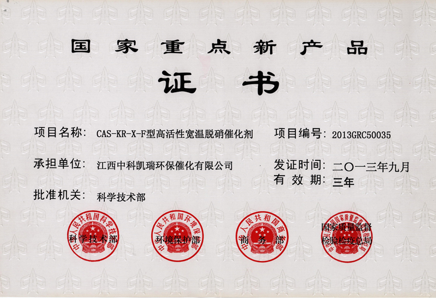2013年江西中科凱瑞環保催化有限公司生產的CAS-KR-X-F型高活性寬溫脫硝催化劑產品榮獲國家重點新產品證書。