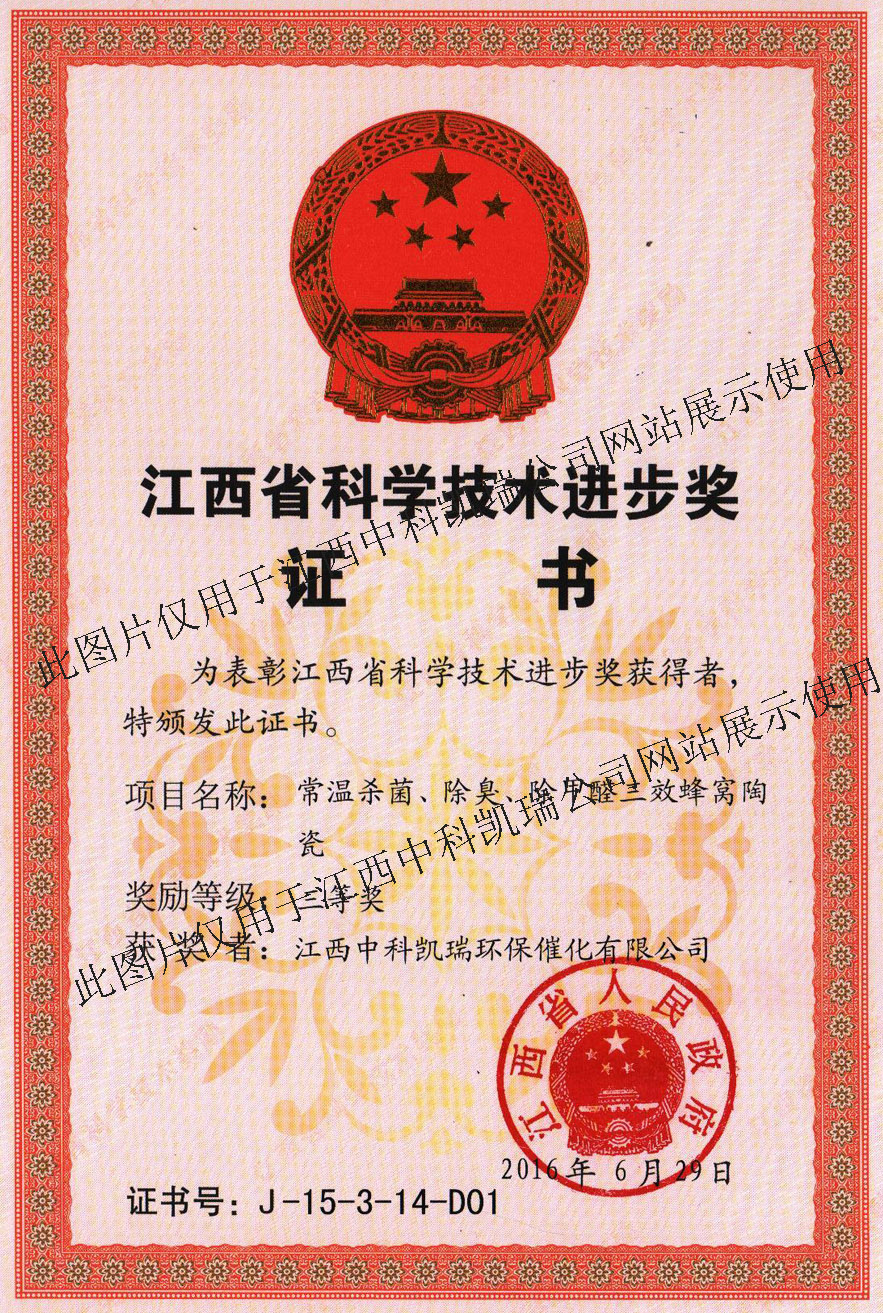 2016年江西中科凱瑞公司研發的殺菌、除臭、除甲醛三效蜂窩陶瓷催化劑產品榮獲科學技術進步獎。
